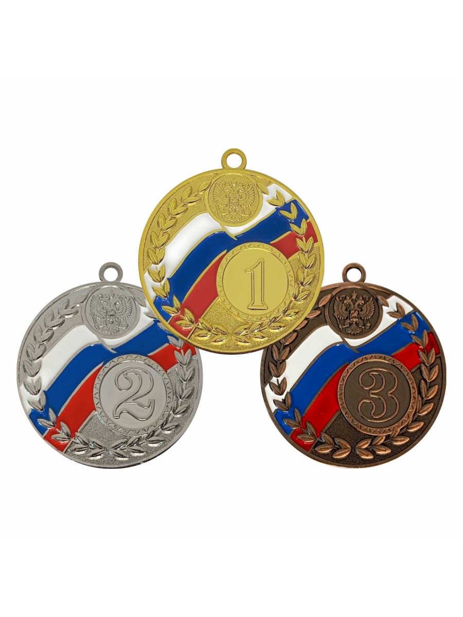 Комплект медалей состоит из 3 медалей в форме круга за 1, 2, 3 места. Медали изготовлены из недрагоценного материала (сплав металлов и цинка). Диаметр медалей 50 мм. Медаль за 1 место золотого цвета, на ее лицевой стороне расположено рельефное изображение цифры 1. Медаль за 2 место серебристого цвета, на ее лицевой стороне расположено рельефное изображение цифры 2. Медаль за 3 место бронзового цвета, на ее лицевой стороне расположено рельефное изображение цифры 3.