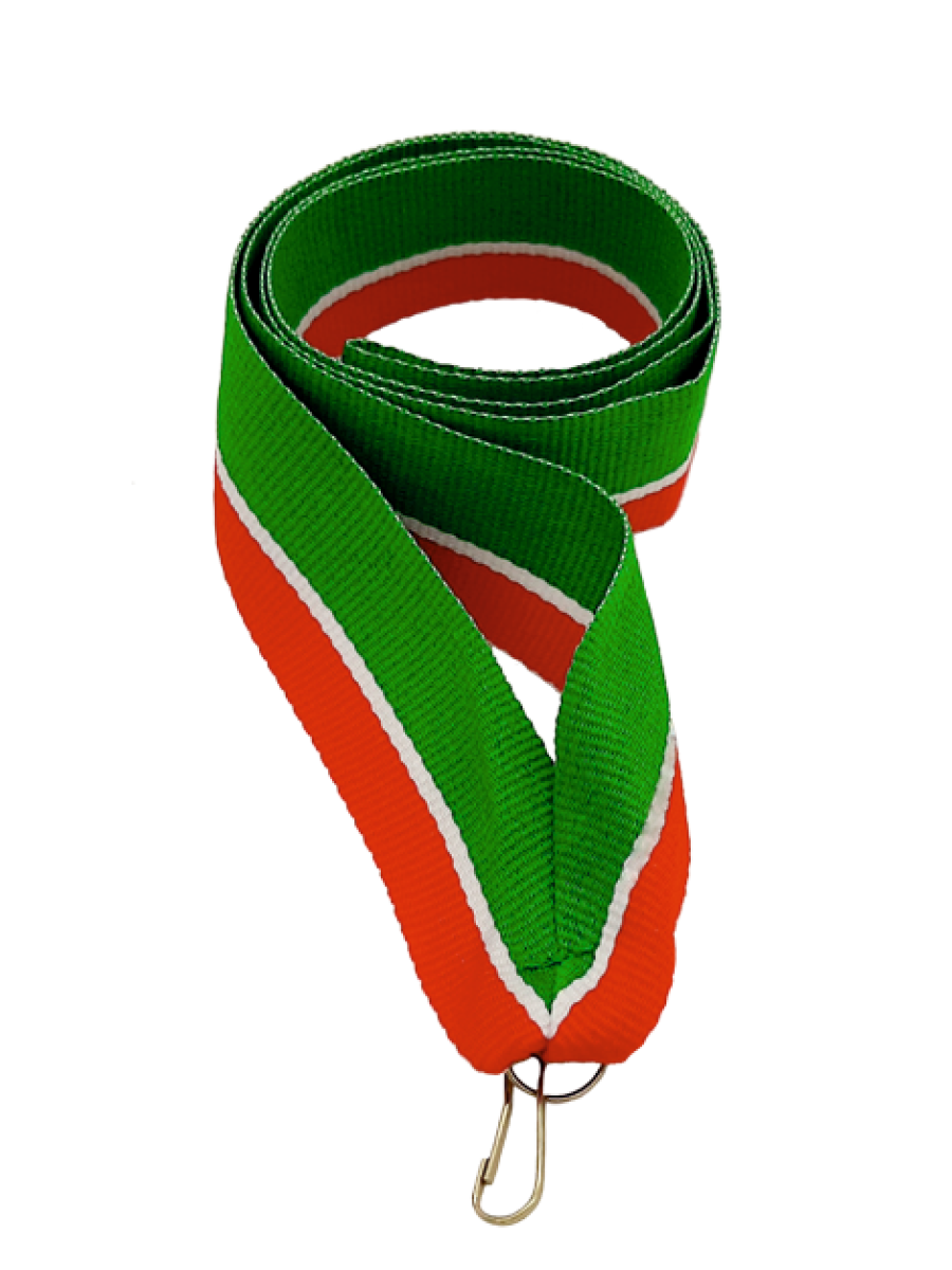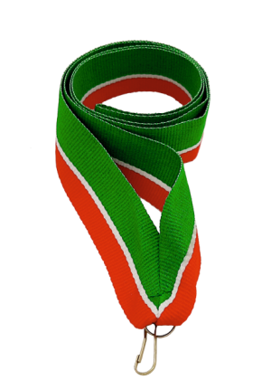 Ширина 22 мм, сшита на металлический карабин с кольцом, материал жаккард, двухсторонняя. Цвет красно-бело-зеленый