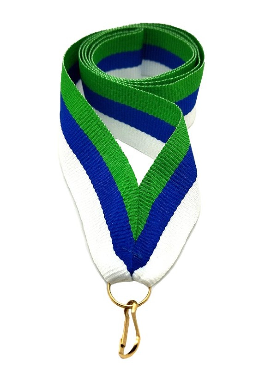 Ширина 22 мм, сшита на металлический карабин с кольцом, материал жаккард, двухсторонняя. Цвет бело-сине-зеленый