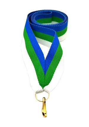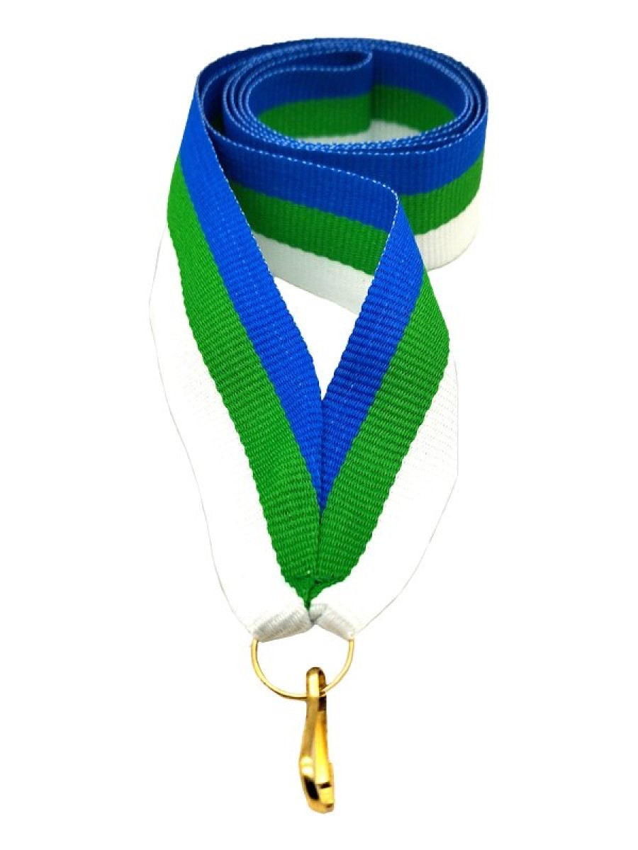 Ширина 22 мм, сшита на металлический карабин с кольцом, материал жаккард, двухсторонняя. Цвет бело-зелено-светло-голубой
