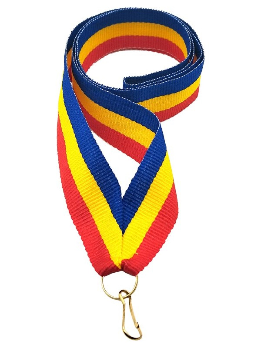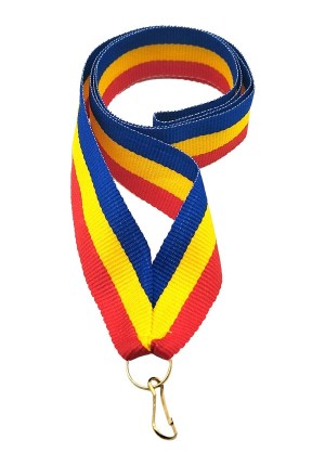 Ширина 22 мм, сшита на металлический карабин с кольцом, материал жаккард, двухсторонняя. Цвет красно-желто-синий