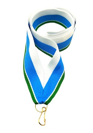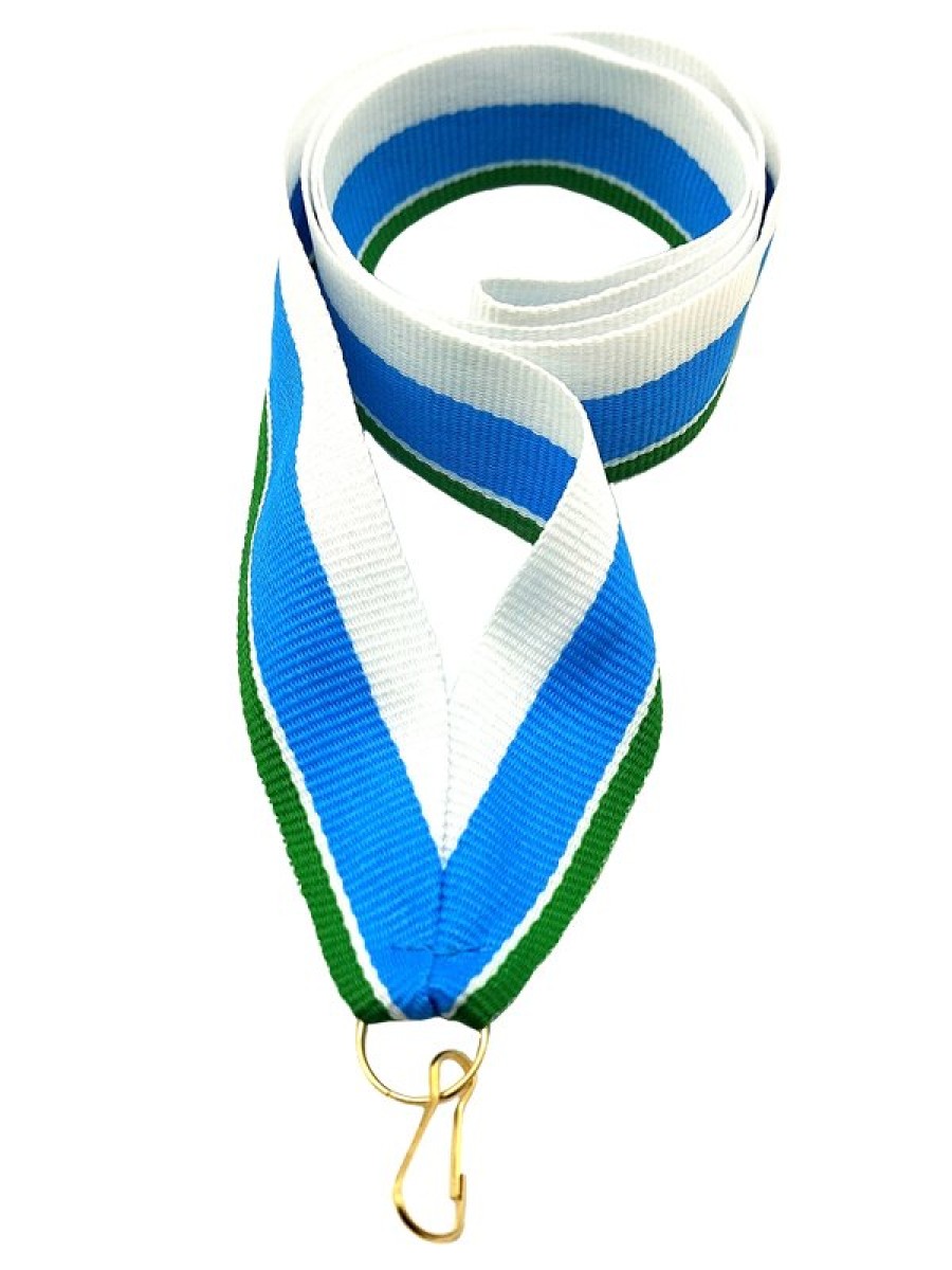 Ширина 22 мм, сшита на металлический карабин с кольцом, материал жаккард, двухсторонняя. Цвет зелено-бело-светло-голубой-белый