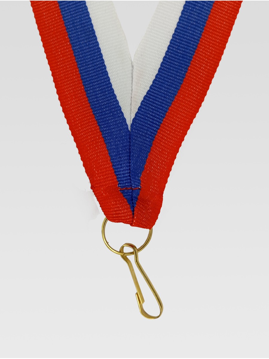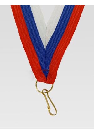 Ширина 24 мм, сшита на металлический карабин с кольцом, материал жаккард, двухсторонняя, длина 80 см. Цвет триколор РФ.