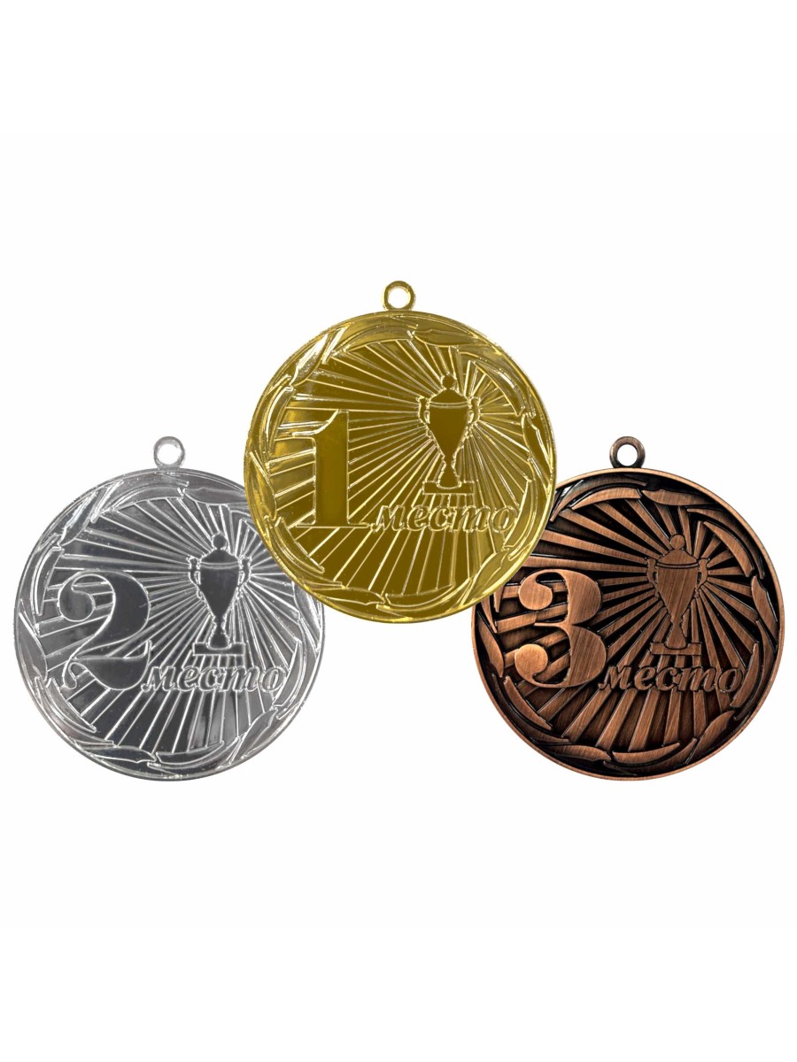 Комплект медалей состоит из 3 медалей в форме круга за 1, 2, 3 места. Медали изготовлены из недрагоценного материала (сплав металлов и цинка). Диаметр медалей 70 мм. Медаль за 1 место золотого цвета, на ее лицевой стороне расположено рельефное изображение цифры 1. Медаль за 2 место серебристого цвета, на ее лицевой стороне расположено рельефное изображение цифры 2. Медаль за 3 место бронзового цвета, на ее лицевой стороне расположено рельефное изображение цифры 3.